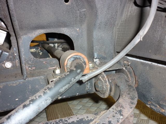 Effectivement il est fendu au dessous, le problème n'est pas là: comment démonter le boulon de fixation avant du triangle de gauche? Suite à une touchette, sans doutes, une tôle a été ôtée puis re-soudée, sans la fenêtre qui permettrait d'extraire le boulon! Il a fallu la disqueuse!!!