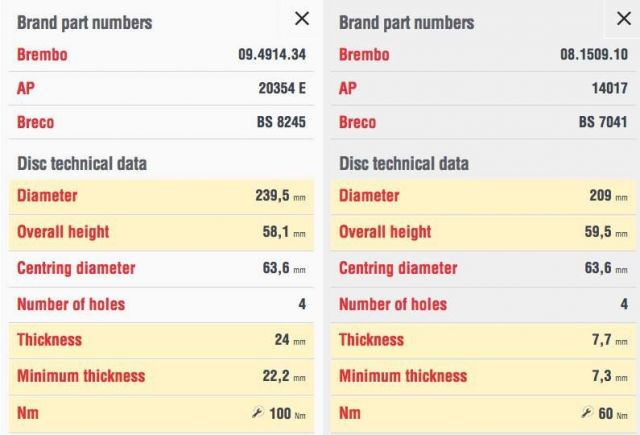 9. C'est le prix sans la VAT, sans l'expédition. J'ai déjà contacté le vendeur, c'est lui qui m'a fourni tous les renseignements sur son kit Le tarif proposé est pour les disques ventilés + plaquette EBC Ultimax heavy duty "Shipping to you is about £30 plus insurance of about £20 so a total to you inc the kit of £816.00 inc vat." Y a moyen de faire un boa de chaque côté mais la place est comptée. Sinon, vous allez surement me dire que mon idée est nulle, mais pourquoi ne pas faire ça. C'est à dire, reprendre les 4 vis de fixations d'origine du disque sur le moyeu. Faire un serrage du nouveau disque, soit en faisant le bon filetage dans le disque avec le pont PCD, soit le serrer à l'aide de BTR (pour que ça rentre dans le moyeu) et d'écrou, le tout dans de la bonne qualité ? Voila les caractéristiques du disque de l'escort ventilé et celui de la midget d'origine