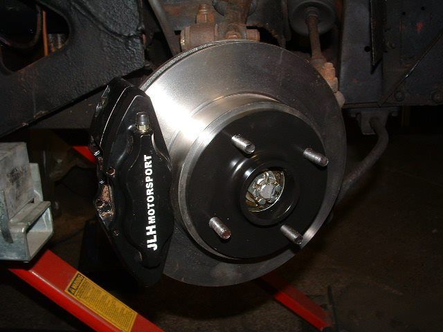 11. Quelques nouvelles pour un upgrade sur les freins de midget. Montage possible pour une dimension minimum de 13 pouces au niveau des roues. Le kit provient de chez JLH, il utilise un moyeu spécifique avec un roulement conique. Ce moyeu permet d'accueillir des disques ventilés de ford escort mk3 en 240mmx24mm (PCD de 4x108) en les retravaillant au niveau des trous de goujons afin que les disques s'adaptent au PCD de la midget (4x 101.6). D'origine le disque fait 210mmx7mm en plein, possible percé et rainuré. Le disque avec ce montage est centré sur le nouveau moyeu, comme un montage moderne et serrer sur le moyeu par les écrous de roue. Une petite vis cruci peut être rajouter pour serrer le disque sur le moyeu comme un montage moderne. Le moyeu existe en alu ou en métal. Gain de poids de 1.2kg pour l'alu contre 2.3kg pour le moyeu d'origine. Concernant les étriers le kit JLH part sur des étriers de marque hi-spec (4 pistons) avec une cale de montage pour reprendre les points d'origine de fixation des étriers d'origine. Au final rien de fou mise à part un moyeu spécifique. Pour le moment le kit JLH se vend complet, pas possible d'acheter juste les moyeux, prix de la totalité 810£ avec l'envoi et la VAT. Un autre fournisseur vend juste les moyeux pour 288£ la paire. Il faudra rajouter une paire d'étrier, le support d'étrier et les disques avec la modification du PCD. Sur les photos, la platine extérieure noire n'est pas obligatoire, elle est la pour des jantes style rostyle, pas besoin pour des minilight par exemple.