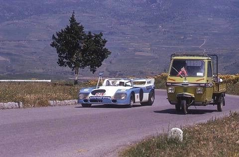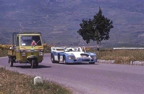 6. Franck parlait de la photo au dessus avec le Piaggio qui fait tout à fait ambiance de la Targa Florio. Merci pour la photo de la 33TT dans la même livrée, ça permet de voir qu’elle est passée de RHD à LHD et que l’entrée d’air en bas de face avant est décentrée dans l’autre sens. Celle avec la Piaggo a dû être mirrorisée pour faire croire que c’était le 3 roues qui doublait la barquette